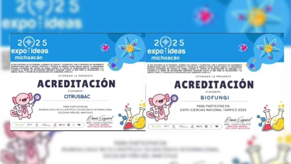 El proyecto CitrusBac, ganó medalla de oro y acreditación internacional para participar en el Mundial Ruta Científica Tecnológica 2025, en Viña del Mar, Chile, que se realizará en el mes de noviembre, y fue presentado por las alumnas Dana Paola Oliveros Pinceno, Evelyn Reina Hernández Puga y Camila Govea Ayala.