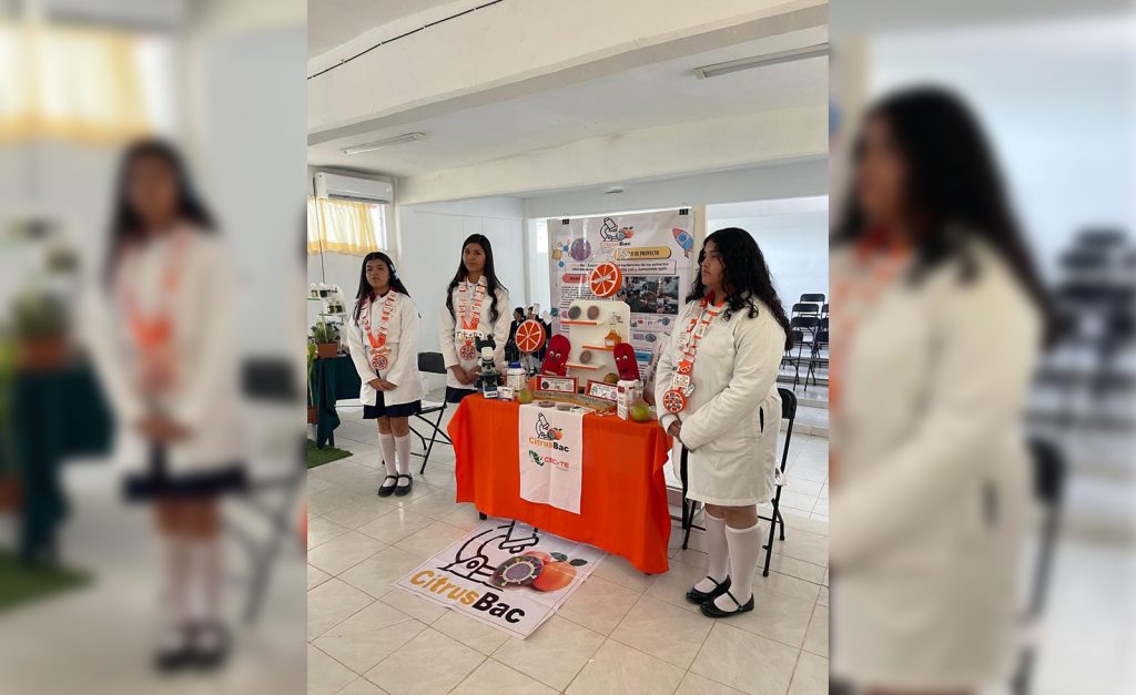 Las alumnas Dana Paola Oliveros Pinceno, Evelyn Reina Hernández Puga y Camila Govea Ayala participan en la categoría de Ciencia Aplicada, quienes presentan Citrusbac, un estudio de la capacidad bactericida de los extractos naturales de la toronja contra Escherichia coli, bacteria que vive en el intestino de las personas y animales.