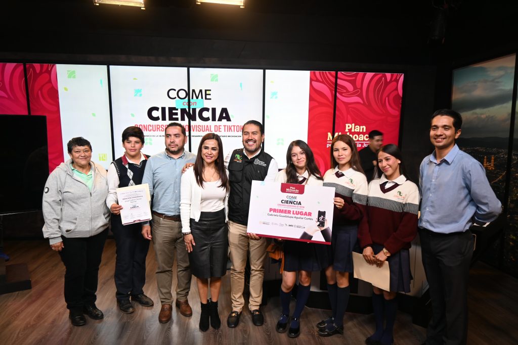 Morelia, Michoacán, 3 de diciembre de 2025.- Las alumnas Gabriela Guadalupe Aguilar Cortés, María Fernanda Villa Cervantes y Dulce María Gallegos Sánchez, del Colegio de Estudios Científicos y Tecnológicos del Estado de Michoacán (Cecytem) plantel Tacámbaro, fueron galardonadas con la medalla de oro en el primer concurso audiovisual en TikTok “Come con Ciencia”, organizado por la Secretaría de Agricultura y Desarrollo Rural (Sader), el Instituto de Ciencia Tecnología e Innovación (ICTI) y el Sistema Michoacano de Radio y Televisión (SMRTV).