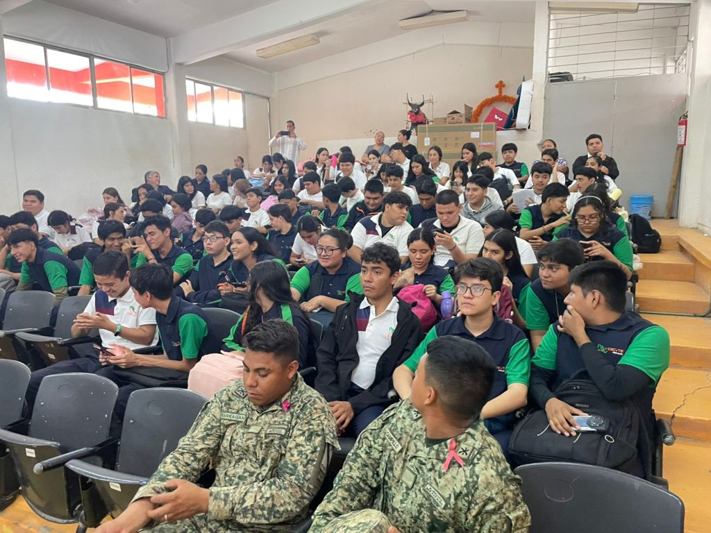 Lázaro Cárdenas, Michoacán, 15 de octubre de 2025.- Estudiantes del plantel Guacamayas del Colegio de Estudios Científicos y Tecnológicos del Estado de Michoacán (Cecytem), participaron en pláticas sobre prevención de adicciones, las cuales fueron presentadas por personal de diferentes corporaciones como la Secretaría de Marina (Semar), Policía Municipal, Guardia Civil y el Ejército Mexicano.